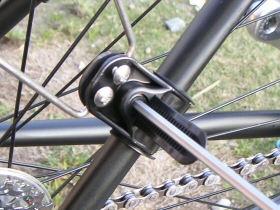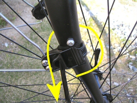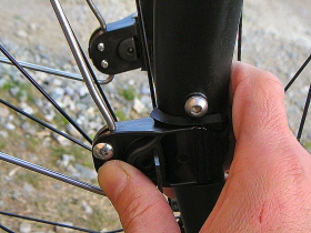 フロント部です。おおよその位置を決めて付属のゴムを内側に挟んで巻いてしまいます。ここにスピードメーターのセンサーが付いている場合は重ならないようにして下さい。ちなみに私の場合は後輪です。余分に出たバンド部分はニッパーで切ってしまいます。その後、プラスのドライバーでステーの部分を締めておきます。あとでセンター出しするのできつく締めない方がよいです。 |