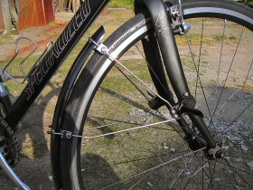 根本のバンド部を親指で押したり(または引いたり)フェンダーとステーの接続部のボルトを緩めてステーの位置を変えるなどして調整します。