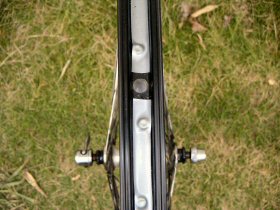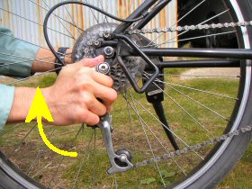 | ホイールを外します。リアタイヤを外すにはクイックレバーを緩めて、ディレーラーを持ち、後ろへ引っ張りながらホイールを落とすようにして外します。外装変速機の付いている自転車はほぼこのやり方で外すことができます。 | ||||||||||||